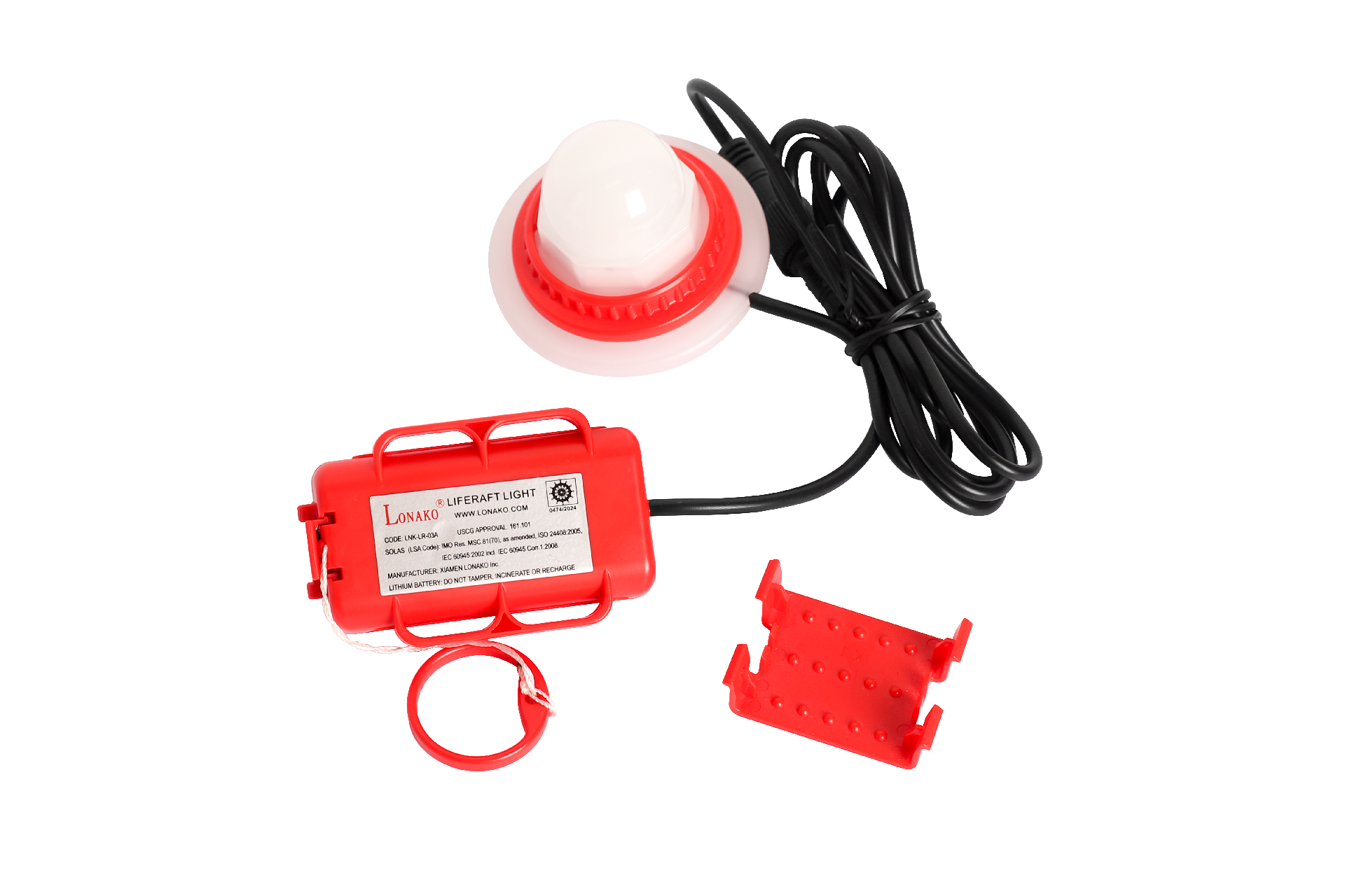 LNK-LR-03A救生筏灯是锂电池供电的救生灯,该产品应与救生筏安装在一起。 当救生筏充气启动时,灯上的“O”形拉环将被自动拉出时,然后救生筏灯的外灯和内灯都会自动启动:救生筏顶部的外灯将输出> 4.3cd强度的闪烁信号,以指示救生筏的位置;而救生筏内部筏灯主体上的内灯会发出0.5cd的常亮光,可供如阅读说明书等基本的照明需求。救生筏灯的外灯和内灯都可以通过灯主体上的手动开关单独打开或关闭。
