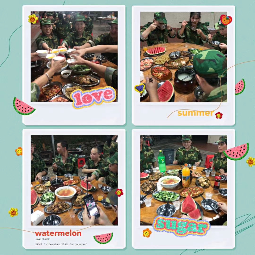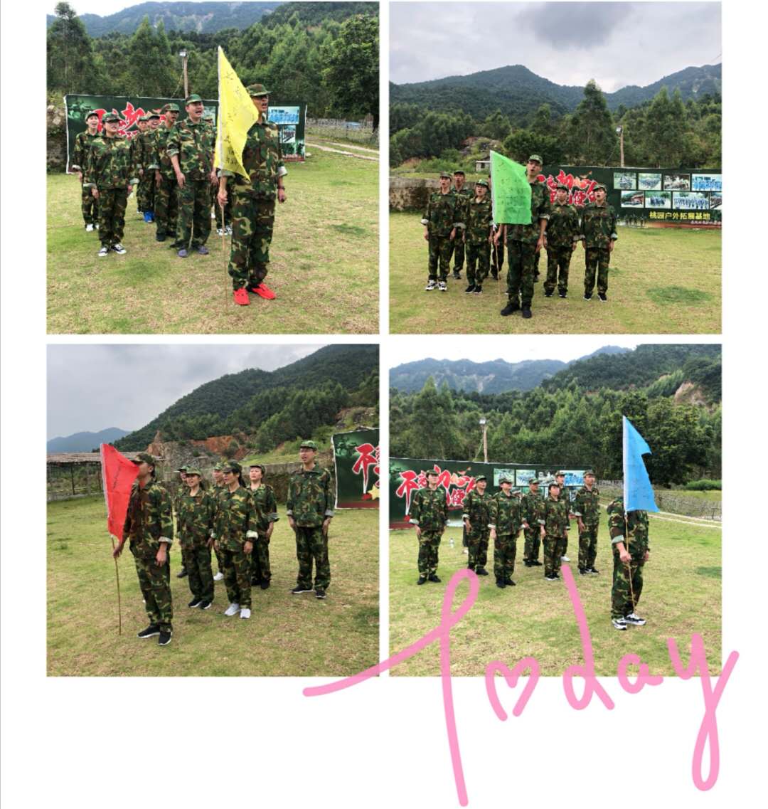 9月26日,早晨7点,我们整装待发前往南安桃园训练基地。上午8点15分我们到达目的地,我们换上了英姿飒爽的迷彩服并排好队伍。本次拓展训练,我们一共分成了四个小分组,选择了属于自己的队旗。在教官的指导下, 我们从整齐报数、军姿站立、稍息立正、齐步行进、敬礼与礼毕、内务整理等常规性项目训练做起,培育员工站有姿、坐有型、行有规的外在形象,进一步提升队伍精神面貌。并且在团队组建、队列展示、会操演练等活动进行了比拼。在训练和比拼中,各组都展现了昂扬向上的精神面貌,不断突破自我,步伐整齐划一,口号震耳欲聋,力争上游。大家在紧张热烈,群情激昂的气氛中结束了第一天的训练。