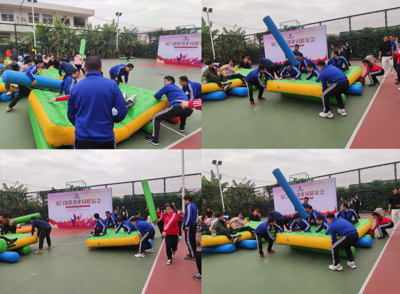5、 Help each other in the same boat: each team sends eight members, four of them sit on the boat, and the other four push the boat and relay the log beneath the boat. At the finish line, the players switch positions and return to the origin.