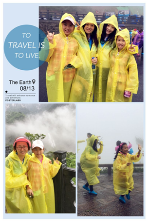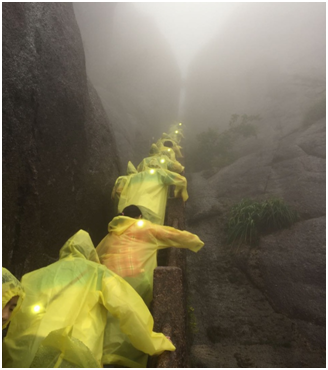 黄山天气变化多端,山下阳光普照,到了山上却刮起了风雨,还好公司提前备好了雨衣和鞋套。考虑到有风雨,山上能见度低,公司还提前为大家准备了救生衣灯,山上游客很多,点亮救生衣灯后,只要看到闪烁的灯光就知道那是我们的队员啦,再也不用担心在茫茫人海中找不到自己的队伍了。