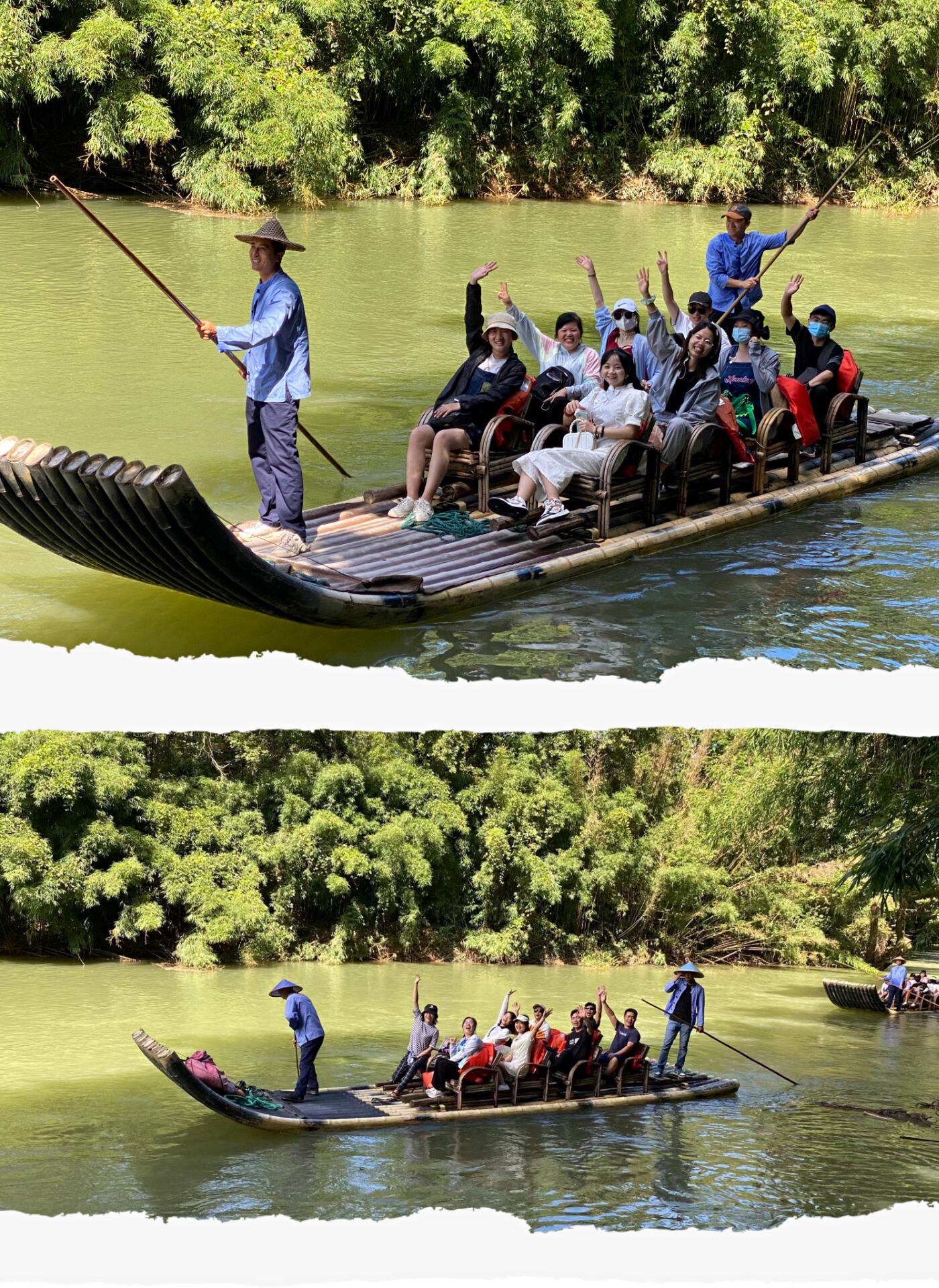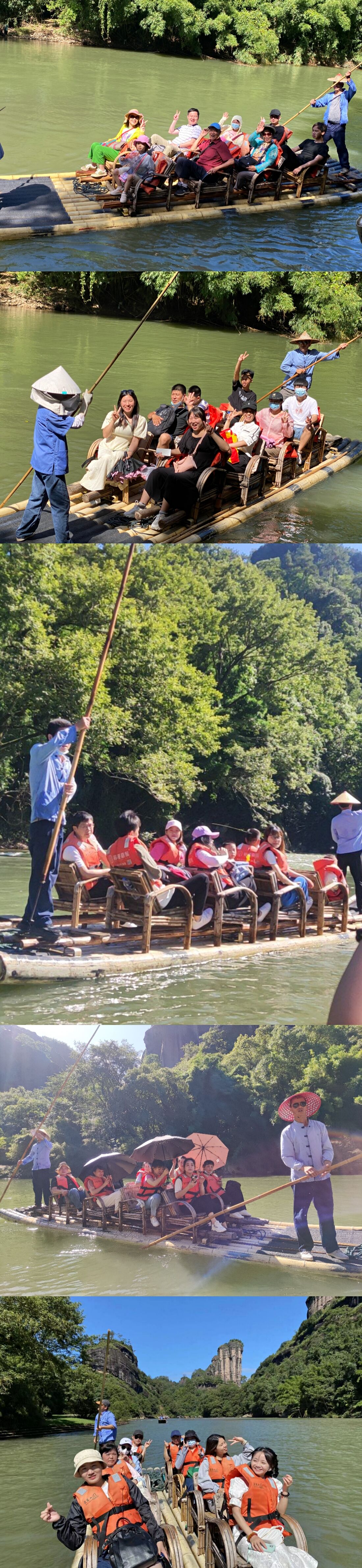 第二天一大早,我们有幸体验了竹筏九曲溪漂流,时长约1.5小时, 大家乘坐宽约2米、长约9米、用六至八根毛竹扎成的古朴竹筏,前部上翘如靴, 配数张背竹椅,安坐其上,冲波击浪而下。真正体会到,舟行碧波上,人在画中游,不仅领略到有惊无险的情趣,而且四面无遮无拦,抬头可见山景,俯首能赏水色,侧耳能听溪声,伸手能触清流,其乐无穷,并且船行至五曲时还可以欣赏到武夷山神秘的船棺文化。下岸后又游览有一千多年的武夷宫和宋街,古色古香,颇有趣意。